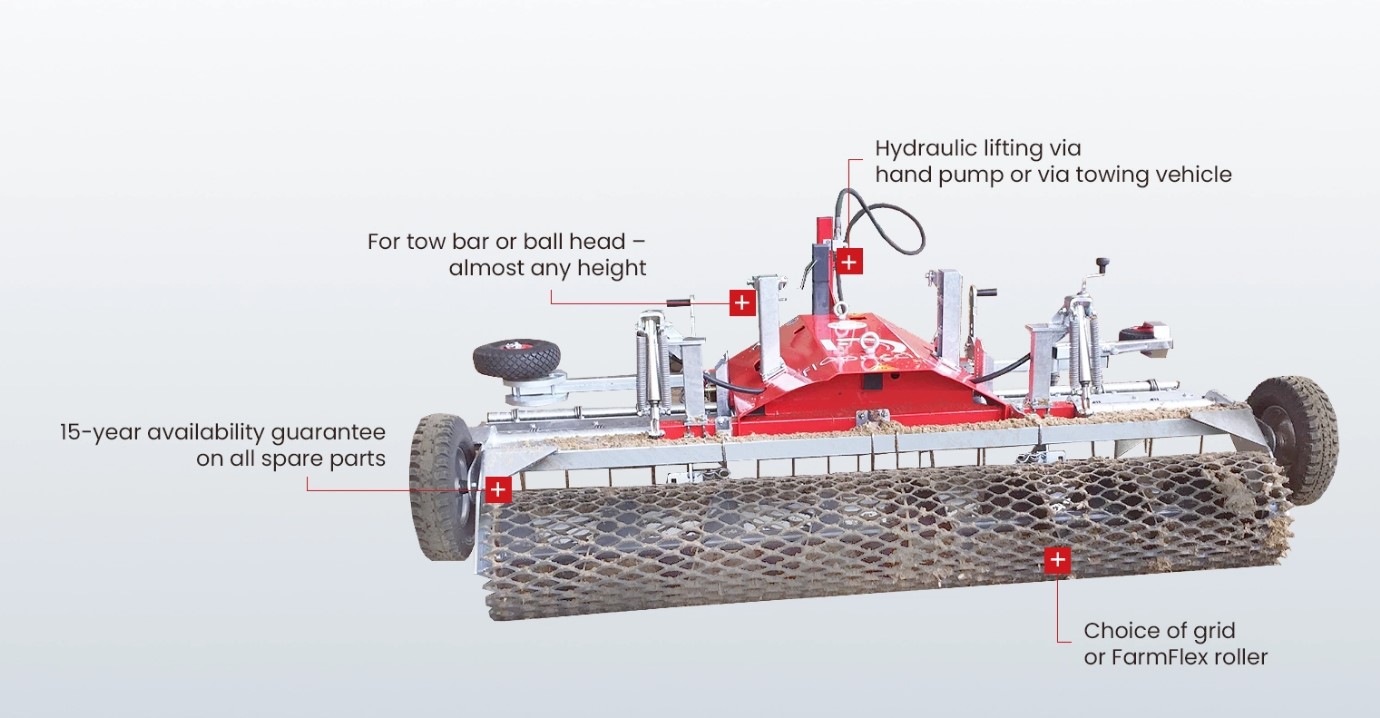 Ridebaneharv som kan brukes med ATV og traktor. Passer fint på sandgrunn. 3 rader med stillbare harvpinner,stillbart skinne for jevnt underlag. Gittervalsen er stabil og du kan stille inn trykket på denne, kan også fåes med gummivalse som passer godt for underlag på sprangbaner. Innvendig spiral i valsen som forhindrer at denne tetter seg. Denne harven fås i arbeidsbredde 150, 160, 180 og 200cm. Kort leveringstid på bestillingsvare.