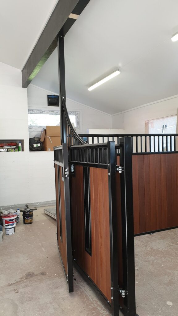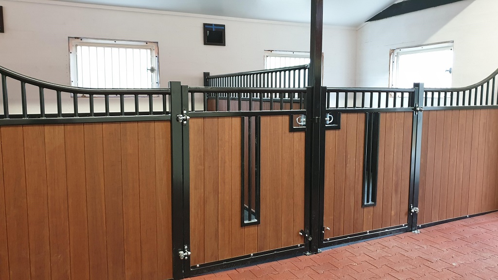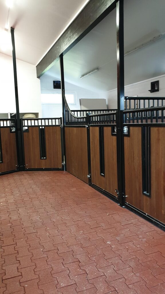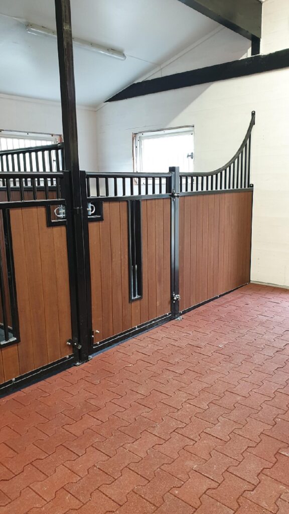 Ringerike Gård, Sørkedalen har valgt stallinnredning Fårø pulverlakkert sort med bambusplanker og ventilasjonsgitter. På gulvet har de lagt gummifliser med mursteinsutseende.