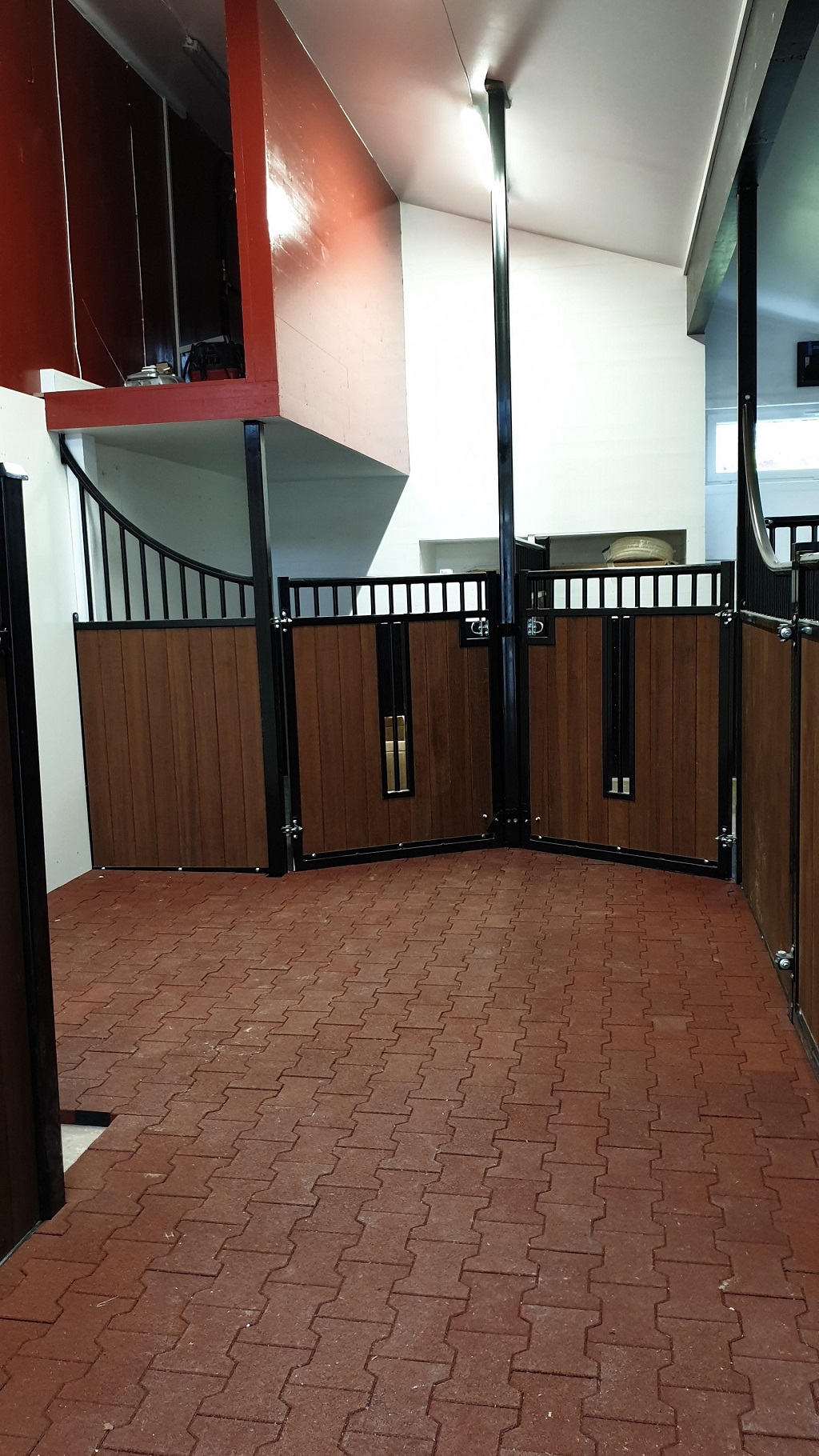 Ringerike Gård, Sørkedalen har valgt stallinnredning Fårø pulverlakkert sort med bambusplanker og ventilasjonsgitter. På gulvet har de lagt gummifliser med mursteinsutseende.